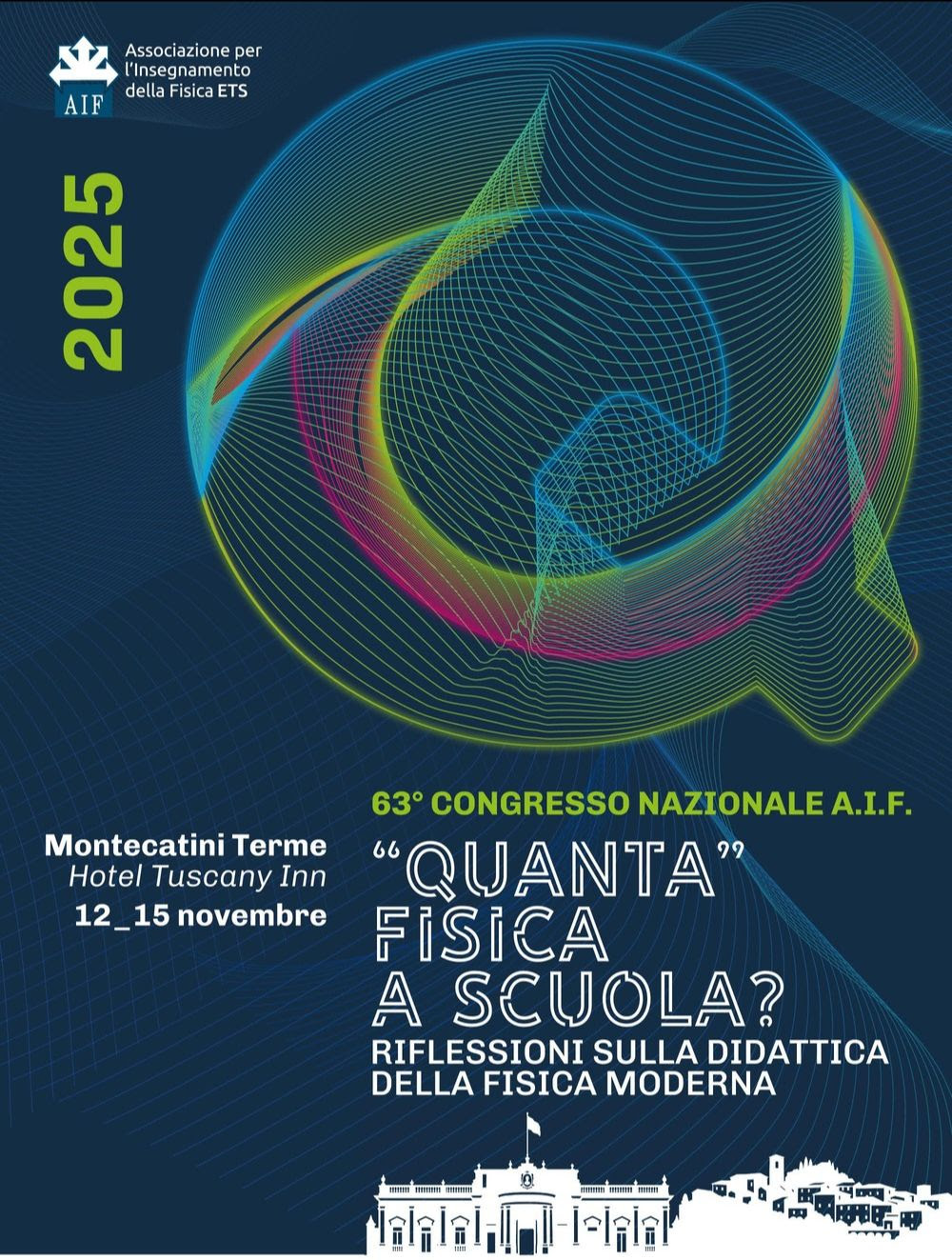 "Quanta" fisica nella scuola, riflessioni sulla didattica della fisica moderna: è il titolo del 63° Congresso AIF che si svolgerà dal 12 al 15 Novembre a Montecatini Terme presso l'Hotel Tuscany Inn presso l’Hotel Tuscany Inn in via Cividale 86/E e presso il Liceo Statale “C. Salutati”.